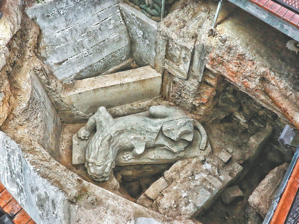A statue of a water-harnessing beast unearthed from the Zhengyang Bridge ruins. JIANG DONG/CHINA DAILY
