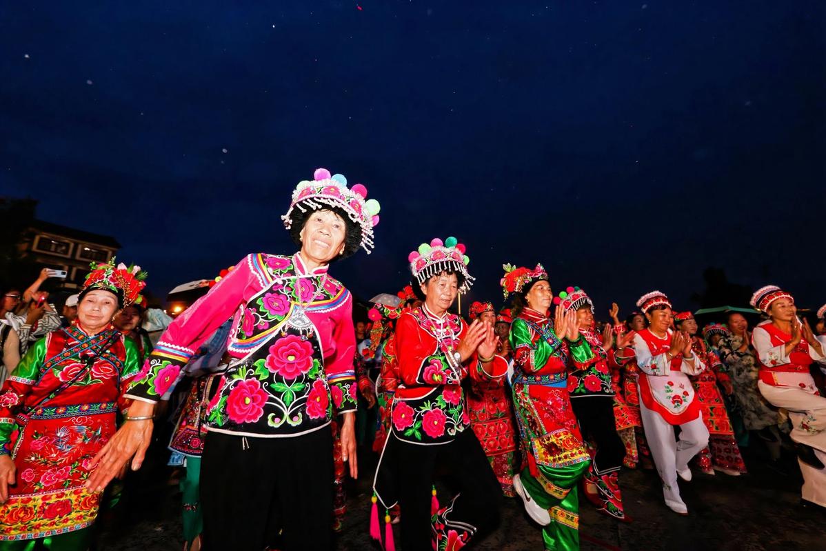 Festive scene of the Dage folk dance on July 30 in Weishan county, Yunnan province [Photo/Xu Jun]