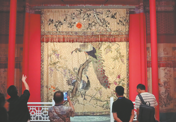 One of the most eye-catching items is a 4.25-meter-wide, 3.57-meter-high stage curtain, a replica of the one he used during his tour in the US, shown to the public for the first time. The curtain features different patterns, including two peacocks, chrysanthemums, lilies and 30 magpies standing on tree branches.