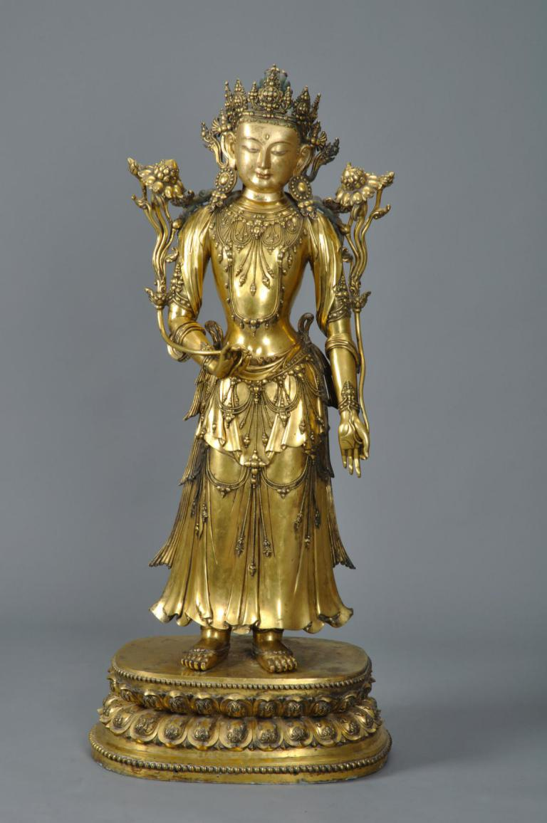 Blending the Han and Tibetan Buddhist features, it is the largest Yongle gilt bronze statue discovered in China so far. With exceptional craftsmanship, the statue is a national treasure housed at the Qutan Temple in Ledu, Qinghai province.