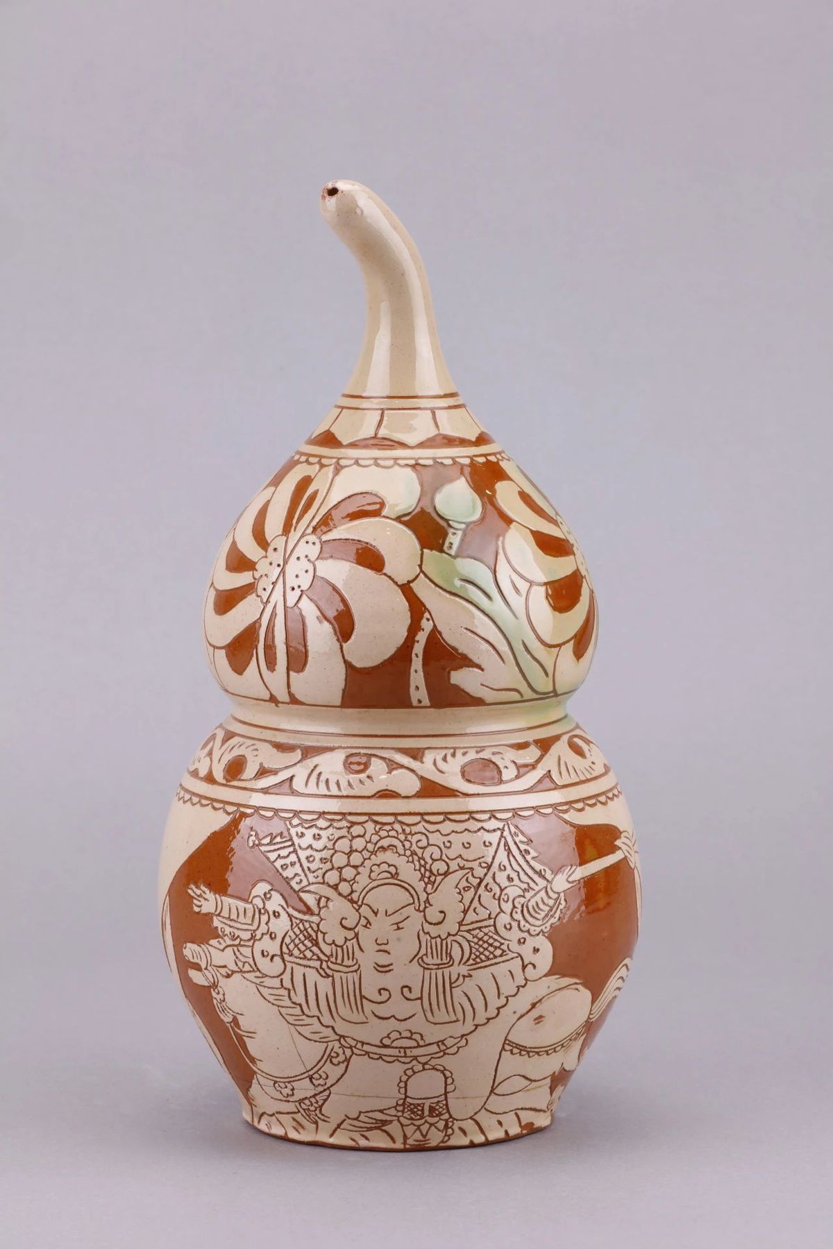 Sancai gourd-shaped vase engraved with armed figure motifs, from the collection of the Intangible Cultural Heritage Protection Center of Fuyang [Photo/Official WeChat account of the Suzhou Museum]