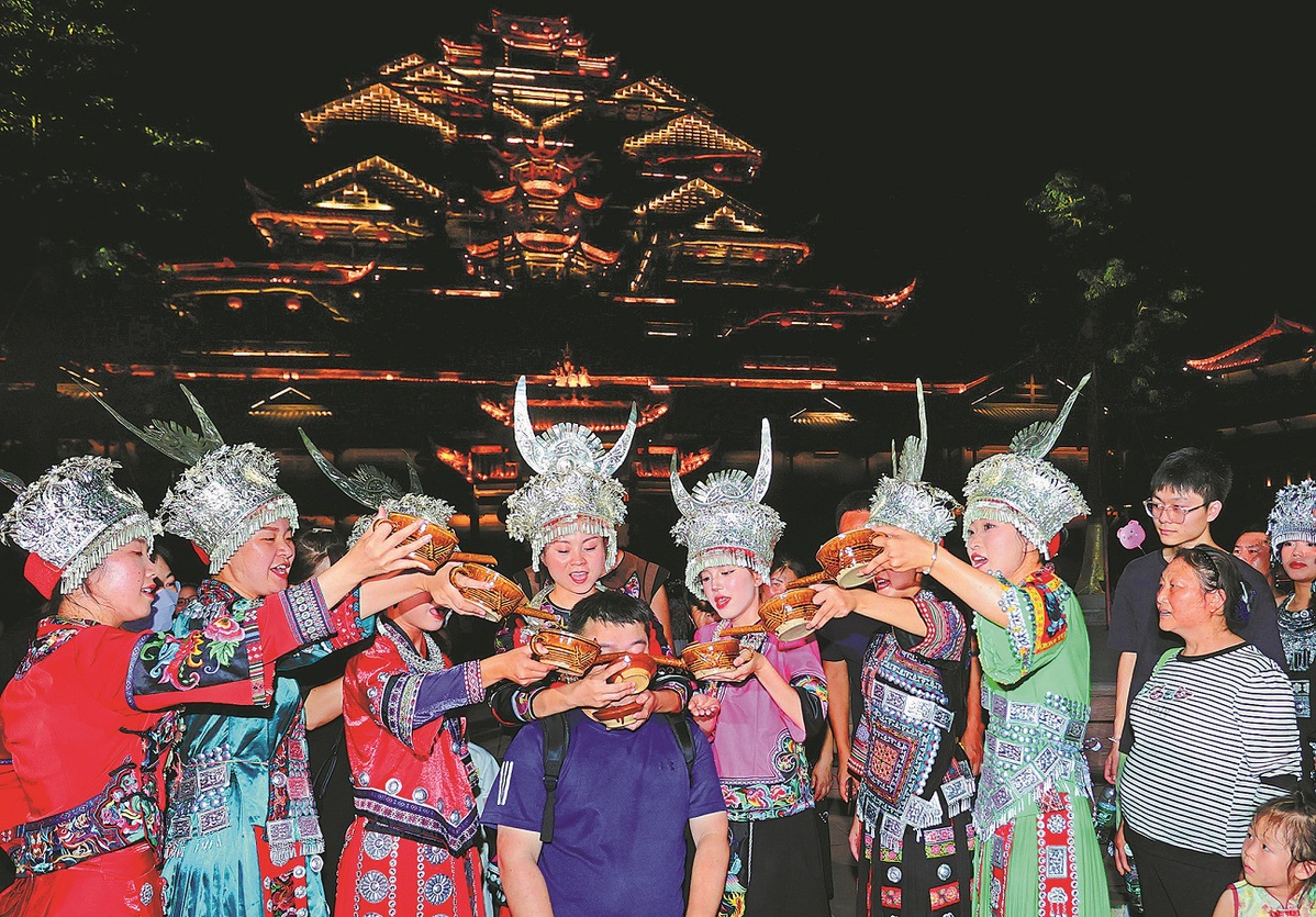 A tourist experiences Miao hospitality at Chiyou Jiuli Town in Pengshui Miao and Tujia autonomous county, Chongqing. [Photo provided to China Daily]