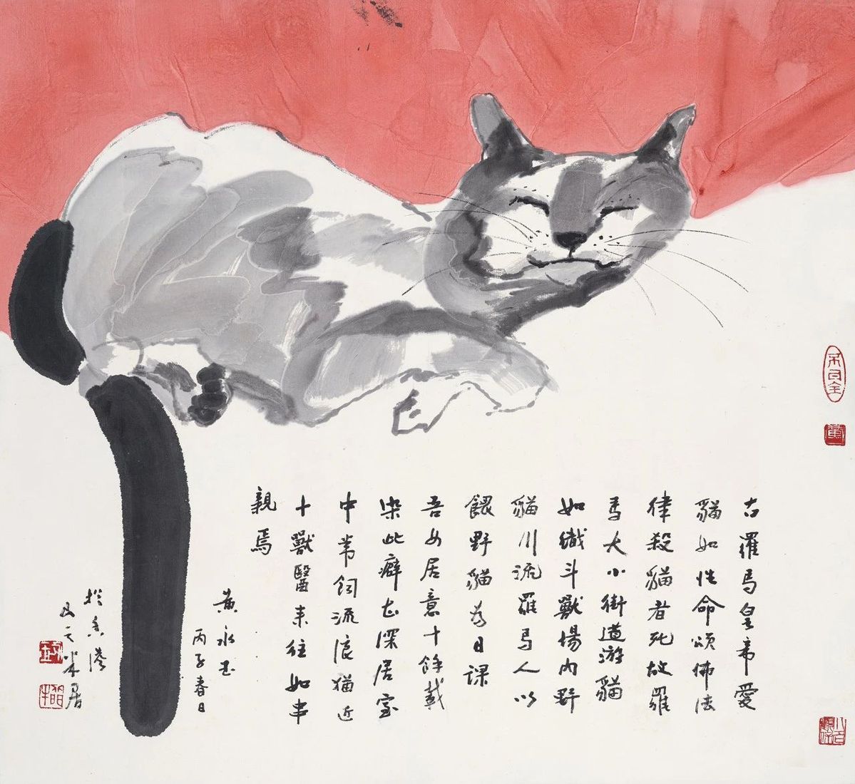 Wouldn't you love to be as relaxed and carefree as the Roman cat depicted in this beautiful artwork? Painted in 1996 by the renowned artist Huang Yongyu (1924-2023), this piece captures the essence of a cat's joyful and leisurely life.
