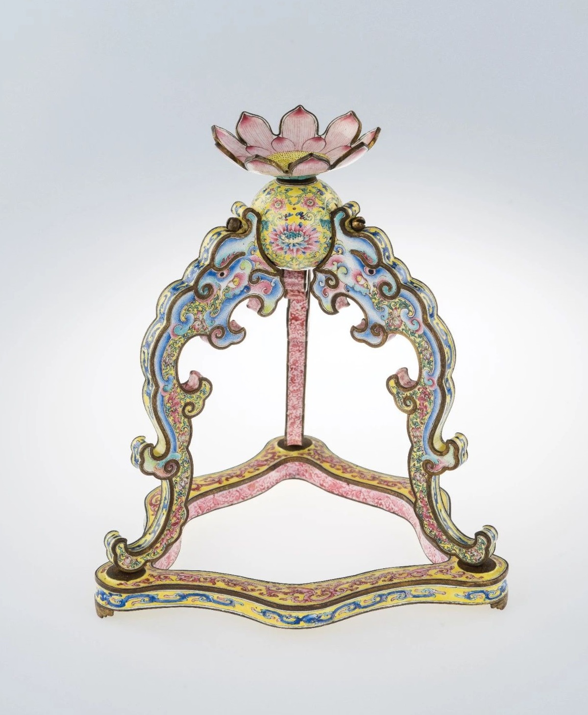 Enamel candlestick in the design of three chi dragons holding a lotus flower [Photo/Official WeChat account of the Hubei Provincial Museum]