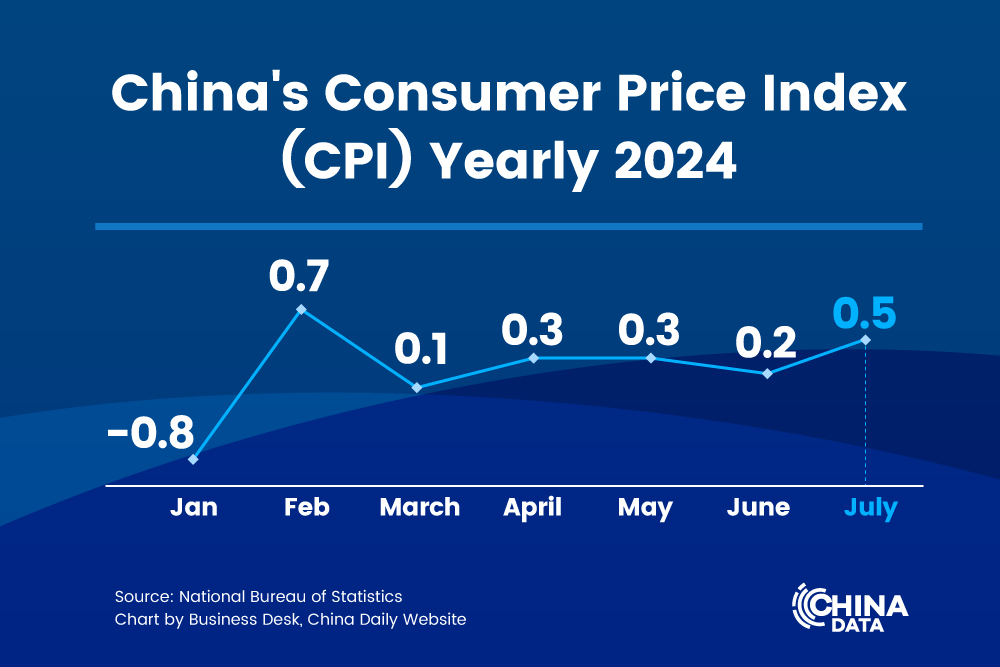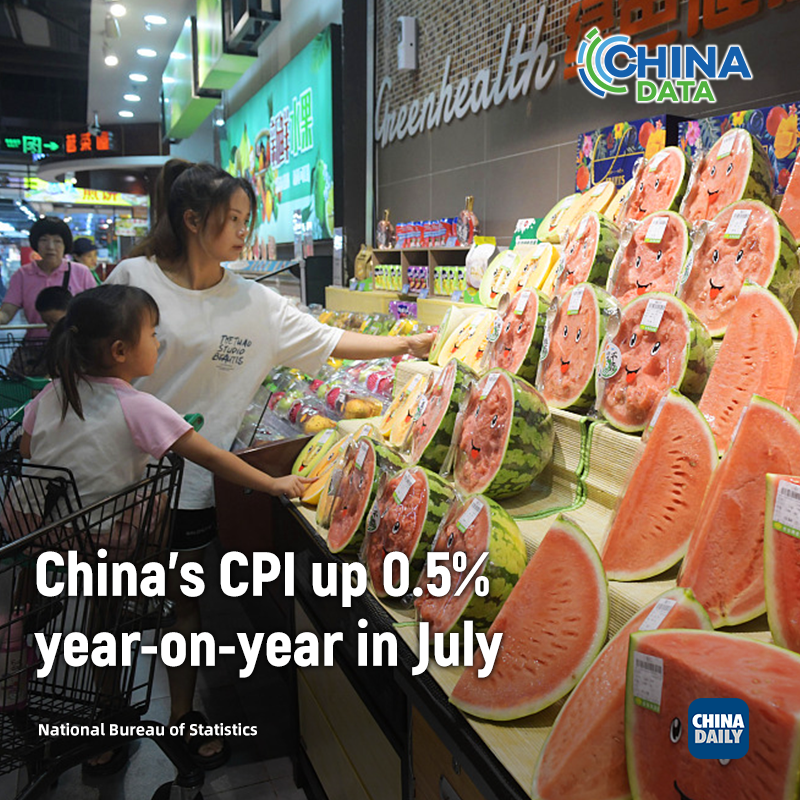 The consumer price index (CPI), a main gauge of inflation, was up 0.5 percent year-on-year in July, slightly higher than the 0.2 percent increase in June, according to the National Bureau of Statistics (NBS).