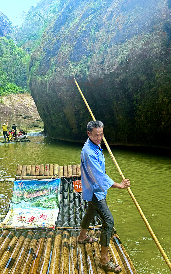 Each trip down the stream requires raftsman Huang Shengteng to push the bamboo pole over ten thousand times. As the 55-year-old skillfully steers the raft with his pole, Huang often chats with tourists, introducing the scenery, sharing anecdotes and sometimes discussing the latest news.