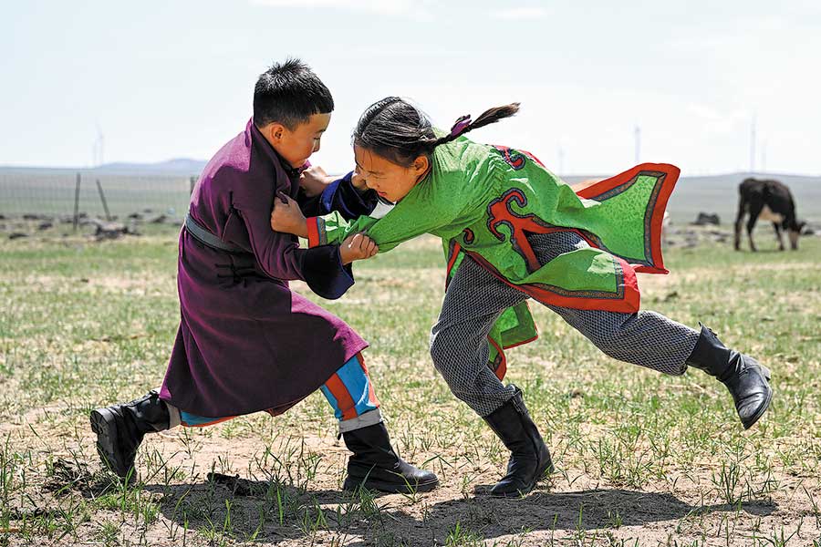 With the grassland as his arena, Chilmeg (left) wrestles his opponent.[Photo/Xinhua]