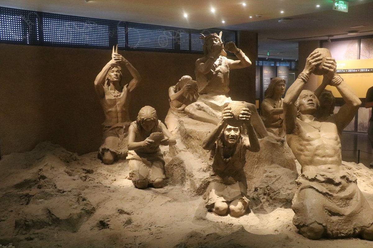 Photo taken on Aug 19, shows the statues of the scene of worship of the Jiahu people. [Photo by Dong Senhe/chinadaily.com.cn]