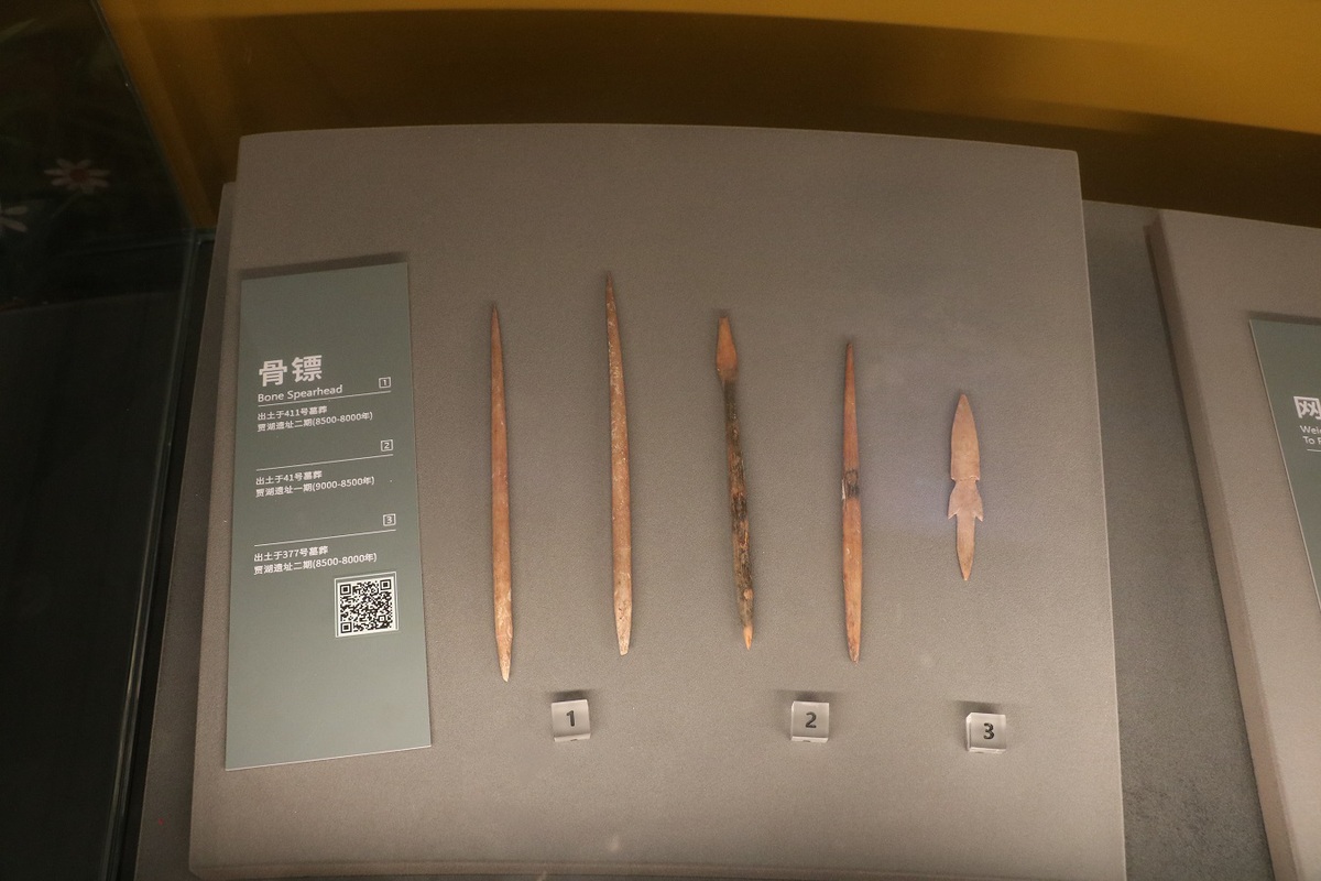 Bone spearheads for hunting used by the Jiahu people are displayed at the Jiahu Site Museum, in Wuyang county, Central China's Henan province, Aug 19. [Photo by Dong Senhe/chinadaily.com.cn]