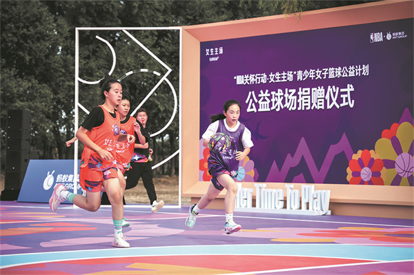 Girls compete in a basketball game in Horqin Right Wing Middle Banner in the Inner Mongolia autonomous region on Friday. The game and the construction of the basketball court were part of a new NBA charity initiative, Her Time to Play. PROVIDED TO CHINA DAILY