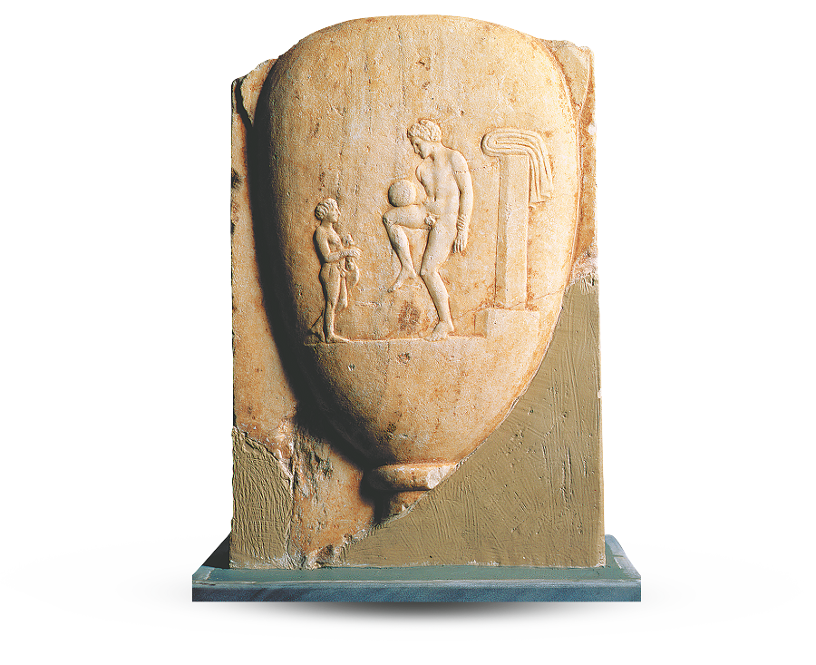 On display at the Nanjing Museum exhibition is an ancient Greek grave stele dating to a period between 400 BC and 375 BC. Depicted on the stele's preserved relief are a naked youth trying to balance a ball on his right thigh and his naked servant boy holding a strigil and aryballos.