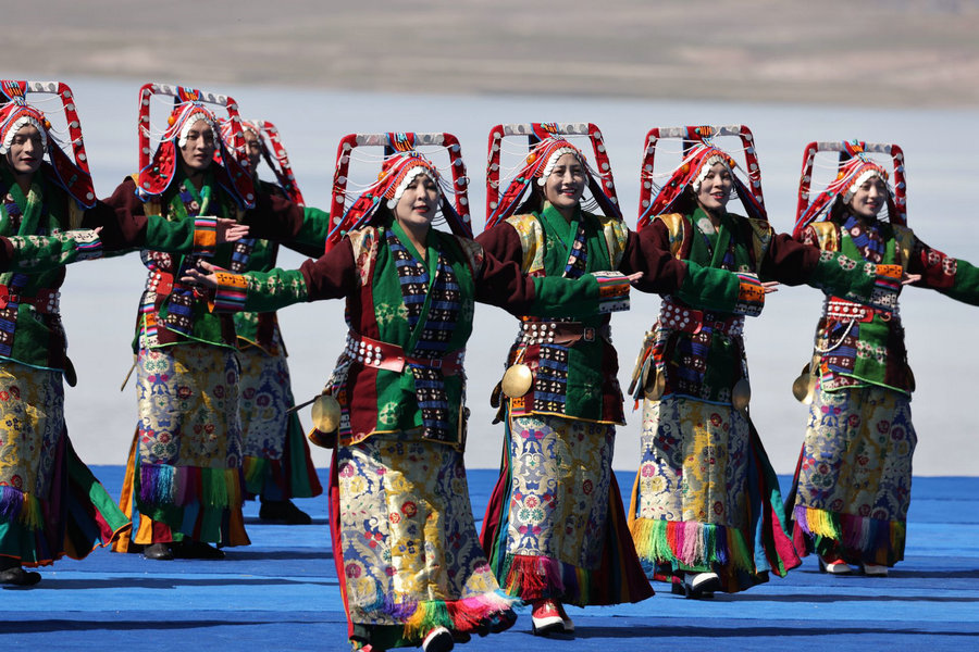 Local Tibetans clad in ethnic costumes perform at the tourism event in Nyima county, Xizang autonomous region. [Photo by Li Jin/China Daily]