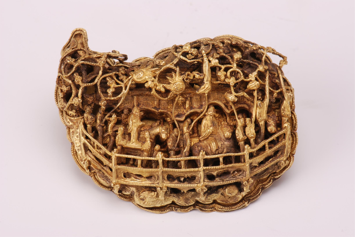 Leaf-shaped gold accessory with figure and flower motifs, Ming Dynasty [Photo/Official WeChat account of the Wuhan Museum]
