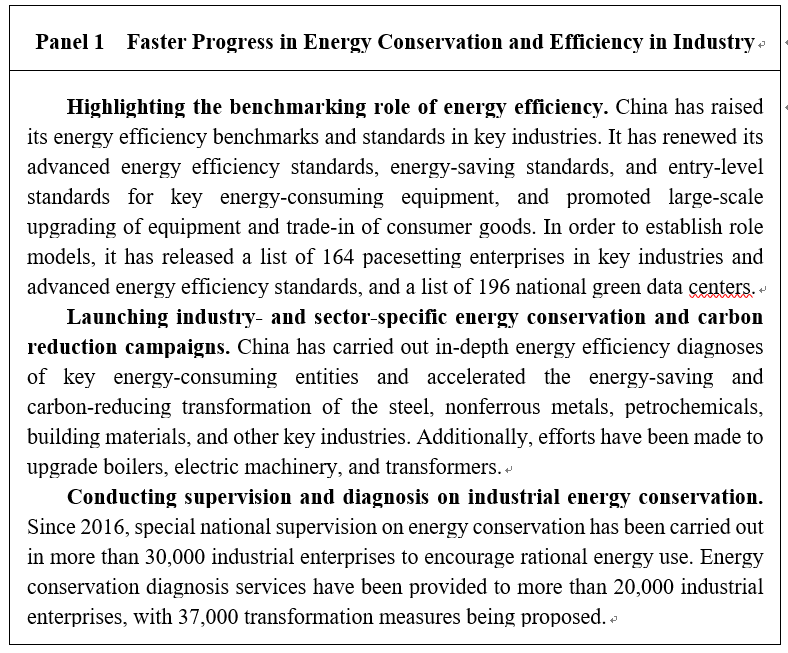 Building a multidimensional energy conservation management system. China fully enforces relevant laws and regulations such as the Energy Conservation Law and the Circular Economy Promotion Law. It works to establish and improve related institutional systems, including energy-saving reviews and supervision over fixed assets investment projects. Clear requirements for energy conservation management of key industries and enterprises have been set, and the energy-saving management of major energy consumers has been strengthened. China has also adopted an energy efficiency pacesetter system to incentivize various entities to conserve energy and raise efficiency. It has leveraged the role of taxation, financial and other policies to steer the entire society towards higher investment into energy conservation and efficiency improvements.