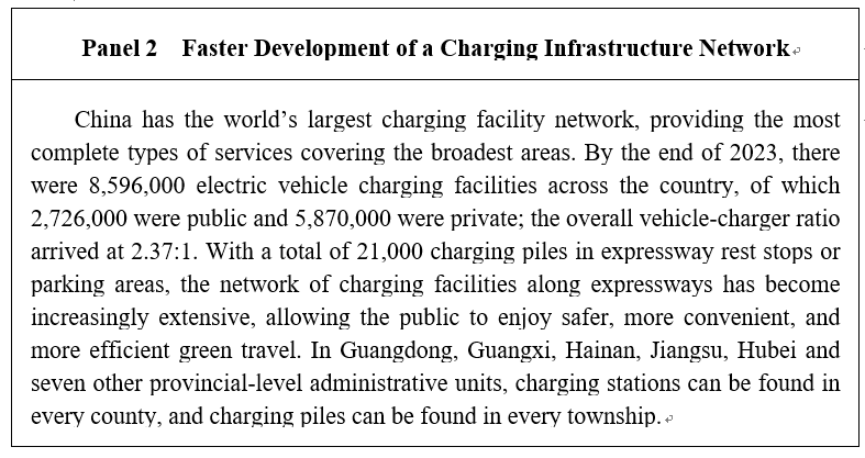Developing a clean and efficient transport system in an all-round way. As logistic and travel needs continue to grow with economic and social development, energy consumption in the transport sector will also increase. China is accelerating the development of multimodal transport, and increasing the share of railways and waterways within its integrated transport system. The country has continued to prioritize the development of urban public transport, optimize its green transport service systems, and promote new energy vehicles in urban passenger transport. It has adopted motor vehicle emission standards that align with advanced international levels, phasing out vehicles that do not meet the National IV or higher level emission standards. As a result, energy intensity in transport has fallen. The comprehensive energy consumption per unit load for railway transport in 2023 dropped by some 19 percent compared with 2013. Efforts have also been made to develop an electric vehicle charging infrastructure network and improve the distribution of hydrogen and natural gas fueling stations and related service facilities. By the end of 2023, there were almost 8.6 million charging facilities andover 450 hydrogen fueling stations nationwide.