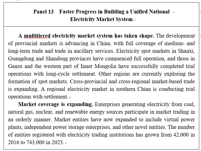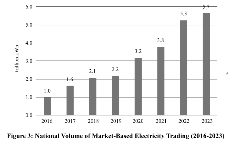 Developing a unified national energy market. China has accelerated progress on a unified national electricity market system that efficiently coordinates trade within and between provinces and regions and integrates medium- and long-term trade, spot trading, and trade in ancillary services. Trading centers for electricity, oil and gas, and coal have been established to create open and transparent energy trading platforms with complete functions. The share of market-traded electricity as part of the national total electricity consumption increased from 17 percent in 2016 to 61.4 percent in 2023. The share of market-traded wind and photovoltaic power accounted for 47 percent of total wind and photovoltaic power generation in 2023. These developments have contributed to a better allocation of electricity and a more efficient utilization of renewable energy.