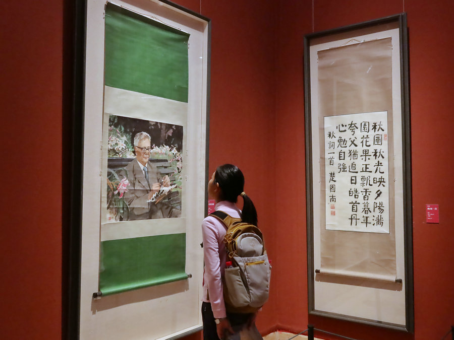 Work by members of the China Democratic League, mostly professional artists, on show at the National Art Museum of China. [Photo by Jiang Dong/China Daily]