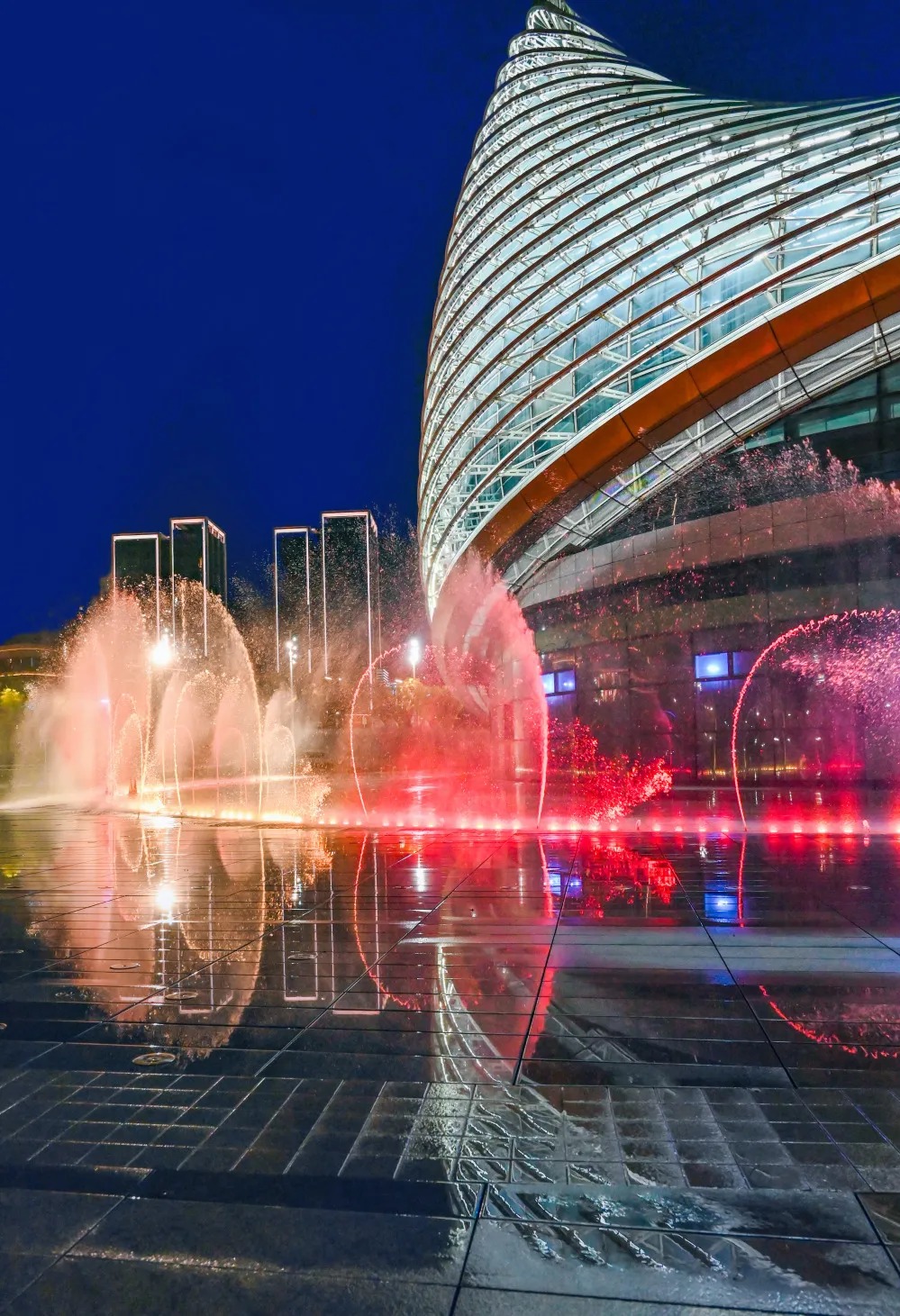 Yantai's Bajiao Bay International Convention & Exhibition Center holds a fountain show on Tuesday. [Photos/Official WeChat account of Yantai's Huang-Bohai Sea New Area]