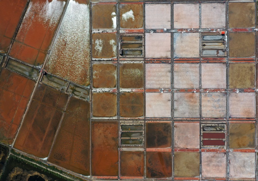 This aerial photo shows salt pans at "Nanji" village of Jiaowei township of Xuwen county, Zhanjiang city, South China's Guangdong province, May 28, 2023. [Photo/Xinhua]