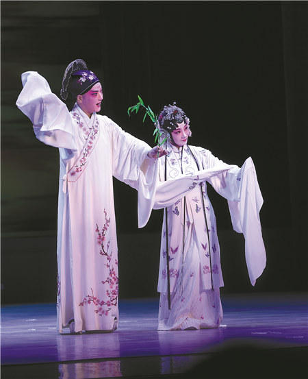 Kunqu Opera actor Yu Jiulin and actress Shen Fengying, who play hero Liu Mengmei and heroine Du Liniang in the youth version of The Peony Pavilion, at Peking University on Sept 16, with performers of the Suzhou Kunqu Opera Theater of Jiangsu. [Photo by Zou Hong/China Daily]