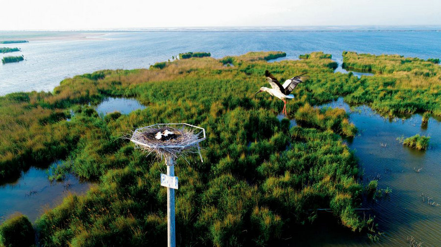Oriental Storks nest on concrete poles specially constructed for birds in the reserve. [Photo by Yang Bin/For China Daily]