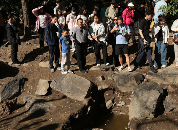About 20 citizens and students, invited to visit the Wenyuan Pavilion archaeological site, engage directly with experts, observe the excavation process and archaeological findings at Yuanmingyuan on Sunday. [Photo by Zou Hong/China Daily]