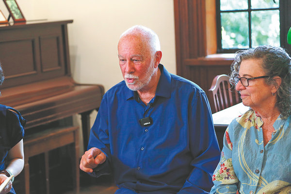 David Avshalomov talks about his family's long connection with China through generations at the former venue of Pathe Recordings studio where his grandfather used to work, on Sept 9. [Photo provided to China Daily]