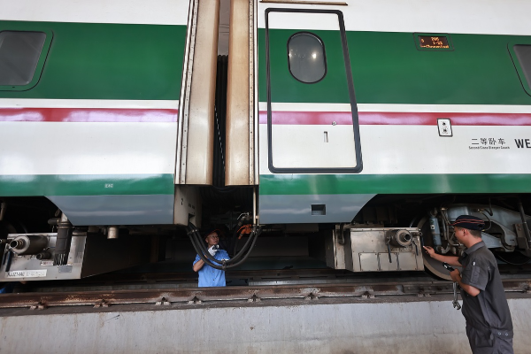 Workers carry out maintenance at a train depot in Chongqing, on Sept 27, 2024. [Photo by Su Zhigang/For chinadaily.com.cn]