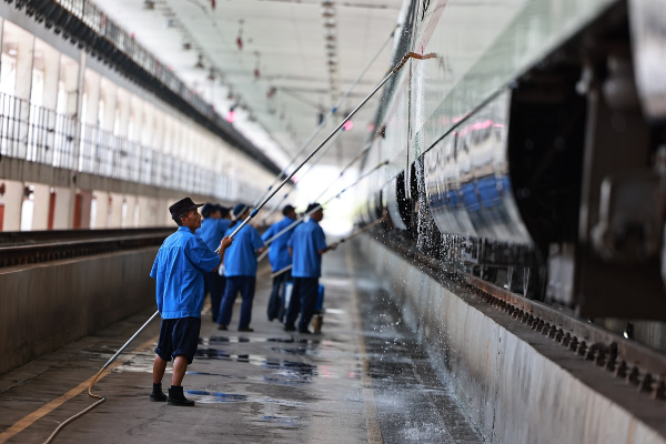 Sanitation workers clean up a Fuxing bullet train at a train depot in Chongqing, on Sept 27, 2024. [Photo by Su Zhigang/For chinadaily.com.cn]