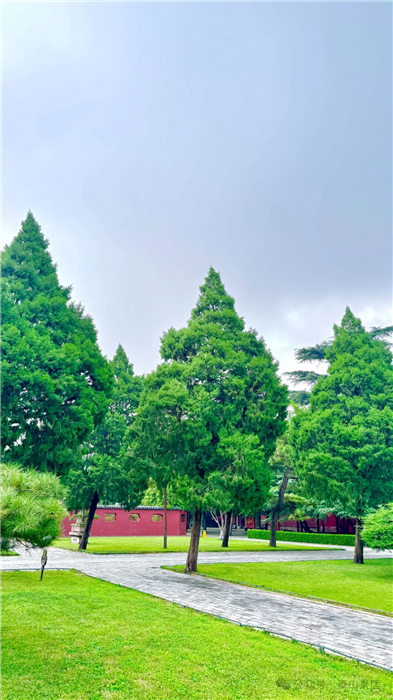 The red walls and green tiles at Daimiao Temple are glossed with an ancient charm in the rain, carrying the sands of time. [Photo/WeChat account: china-taishan]