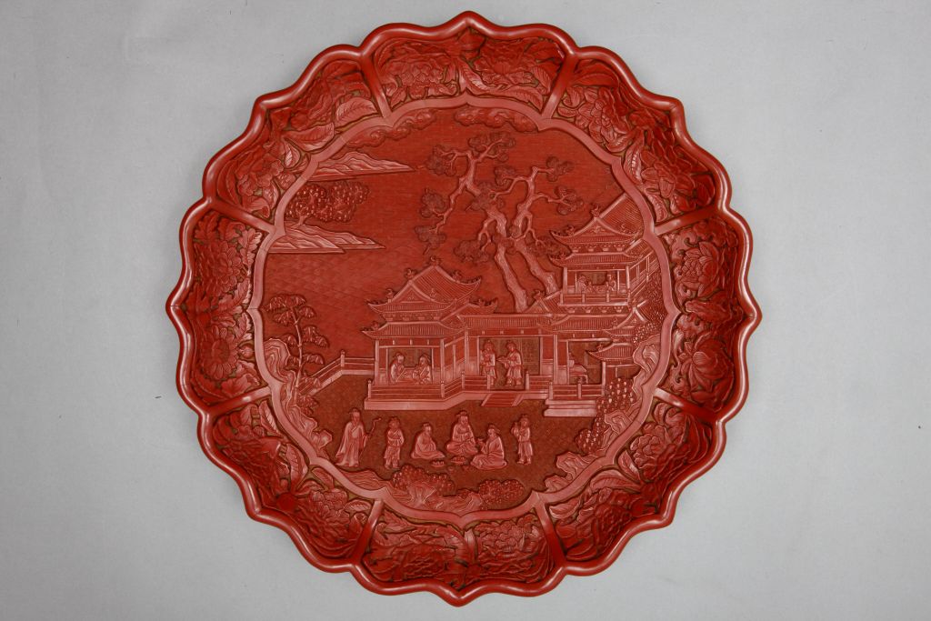Red-lacquered flower-shaped plate with motifs depicting a banquet, Ming Dynasty (1368-1644), from the collection of the Palace Museum [Photo/Official website of the Palace Museum]