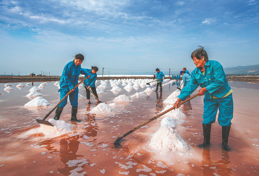 Workers display the five-step salt production process, which Shanxi province has officially recognized as a piece of the region's intangible cultural heritage, at the salt lake on June 17, 2019. [Photo by Xue Jun/For China Daily]