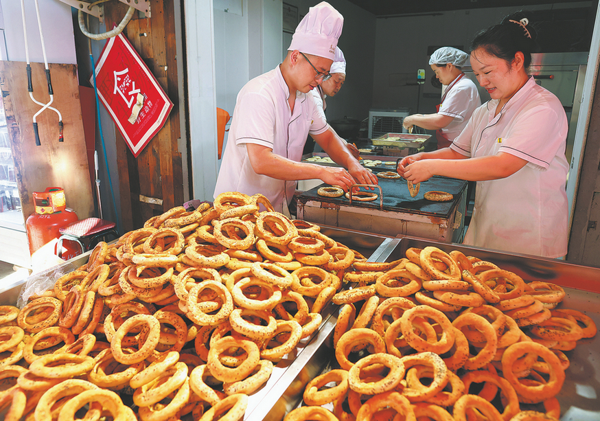 Chefs make local food — gourmet donuts — at a market in Yuncheng on July 20, 2024. [Photo by Zhu Xingxin/China Daily]