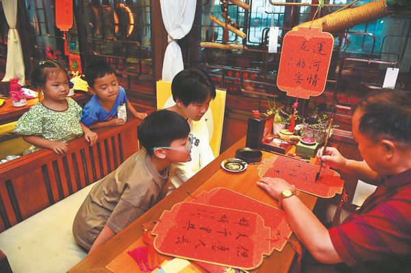 Children watch Chinese calligraphy at a cultural event in Cangzhou, Hebei province, on Sept 16. [Photo by FU XINCHUN/FOR CHINA DAILY]