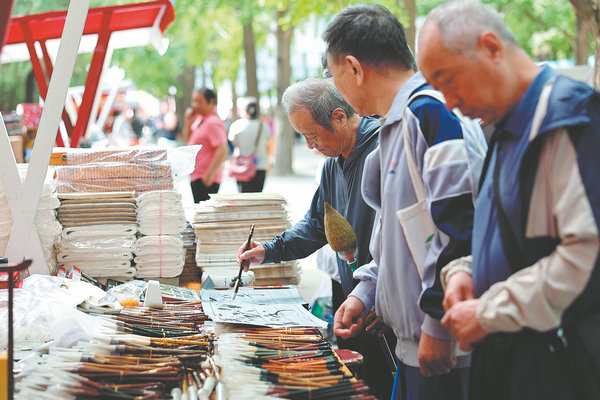 Calligraphy enthusiasts write characters with ink at Ditan Park, Beijing, on Sept 13. [Photo//CHINA NEWS SERVICE]