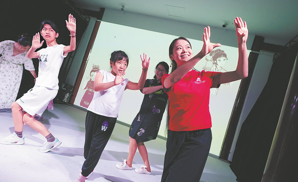 Hu Jingyi (right), a member of the troupe, introduces the knowledge of Yueju Opera to the audience and leads them to experience the performance. [Photo by FANG FEI/FOR CHINA]