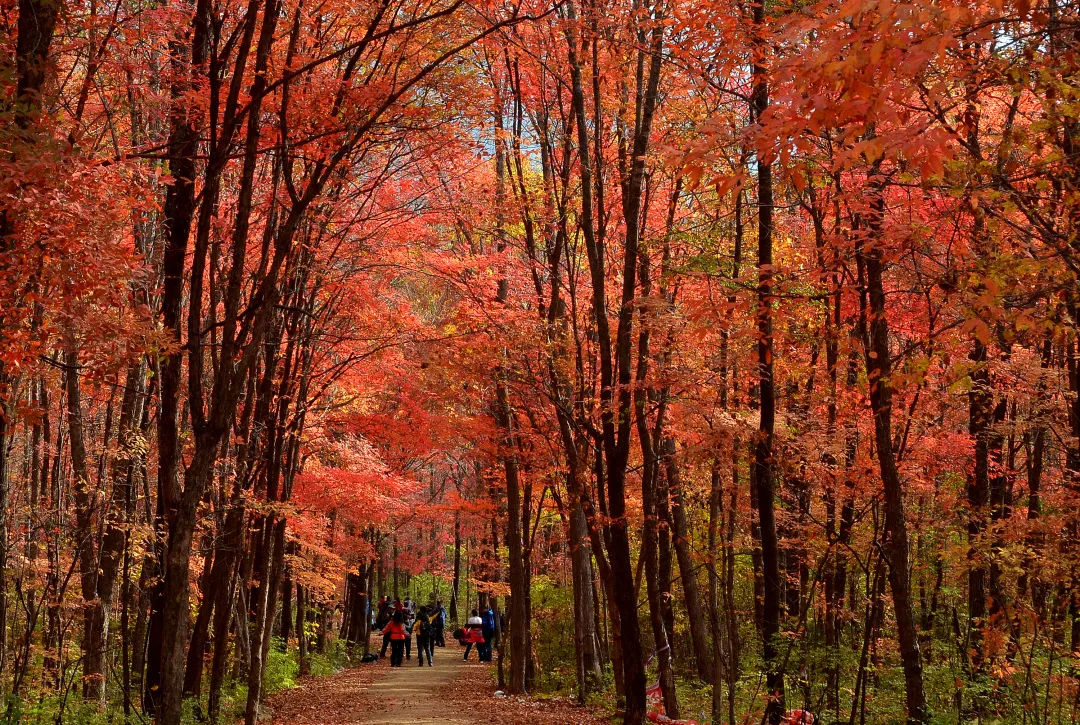 A family meanders along a path under the cover of burnt sienna leaves in Shulan, Jilin province. [Photo by Fu Lihua/For chinadaily.com.cn]
