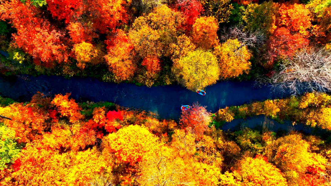 A bird's-eye view of rafters floating downriver amongst autumn trees near Changbai Mountain in Jilin province. [Photo provided to chinadaily.com.cn]