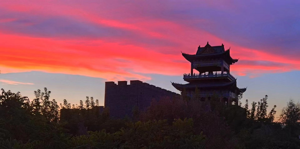 A sunset floods clouds with pastel shades of purple and pink behind a pagoda in Da'an, Jilin province. [Photo by Zhao Guangxin/For chinadaily.com.cn]