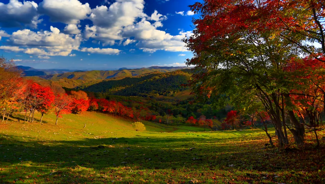 A grassy hillside speckled with autumn leaves cascades toward the horizon in Linjiang, Jilin province. [Photo provided to chinadaily.com.cn]