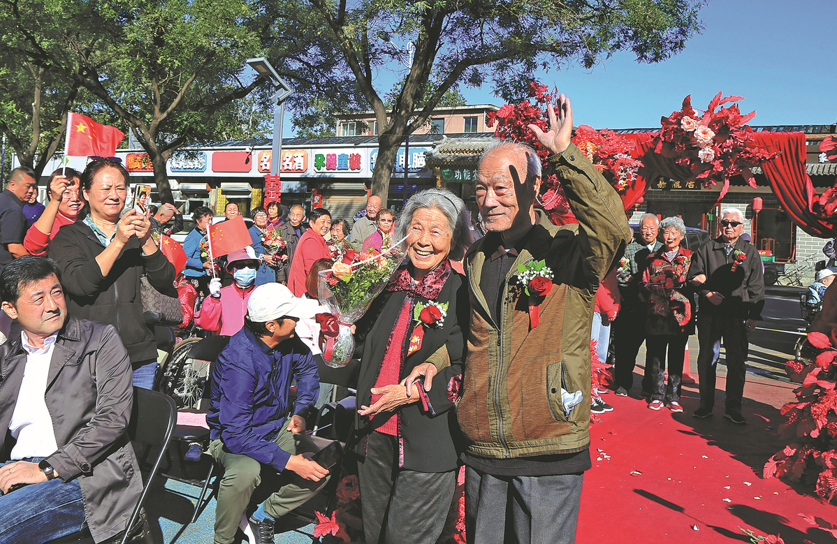 Elderly couples celebrate their wedding anniversaries in a community in Fengtai district, Beijing, on Thursday.  LIU PING/FOR CHINA DAILY