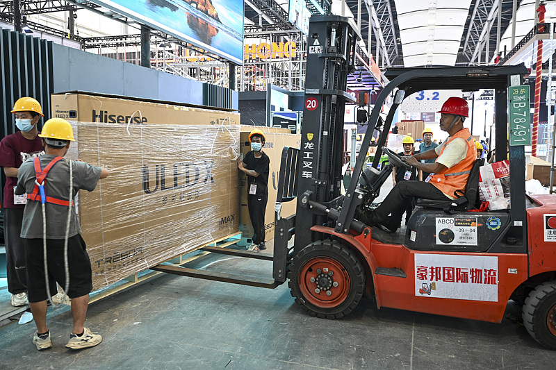 Workers prepare for the 136th session of the China Import and Export Fair in Guangzhou, South China's Guangdong province on Oct 13, 2024. [Photo/VCG]