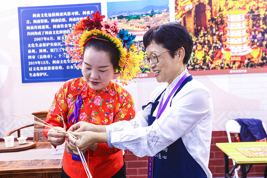 Inheritors demonstrate bamboo weaving at the expo. [Photo provided to chinadaily.com.cn]