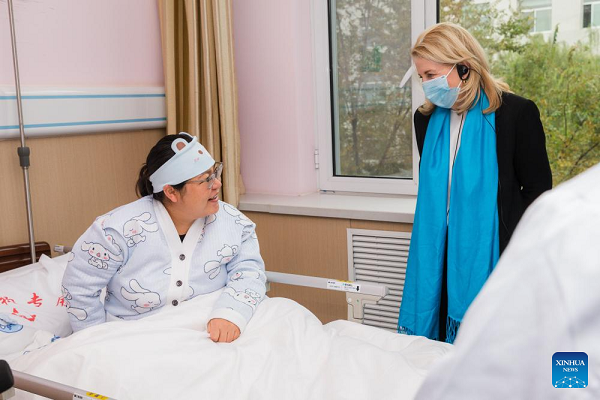 United Nations Children's Fund (UNICEF) executive director Catherine Russell talks with a young mom who benefits from the early essential newborn care at the people's hospital of Yongning County in Yinchuan, northwest China's Ningxia Hui Autonomous Region, Oct. 16, 2024. [Photo/Xinhua]