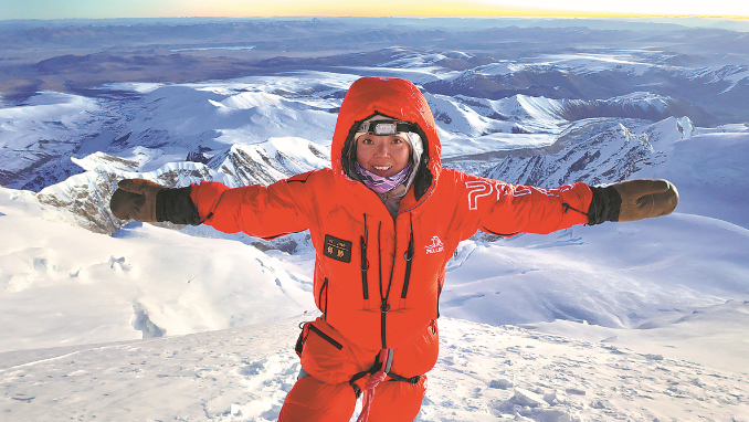 He Jing, from Xi'an in Shaanxi province, reached the summit of the 8,027-meter Mount Shishapangma in China's Xizang autonomous region on Oct 9, completing her historic quest.