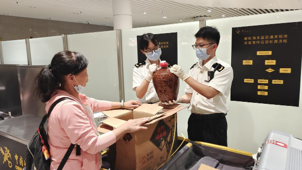 On July 9, Xiamen customs officers conduct on-site inspection of sorghum liquor carried by Kinmen passengers entering the inspection area at Wutong Port. [Photo by Fu Lujie/ For chinadaily.com.cn]