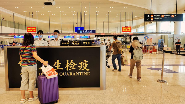 Xiamen customs officers answer questions from a Kinmen passenger on June 6, at the Wutong Port entry channel information desk. [Photo by Fu Lujie/ For chinadaily.com.cn]