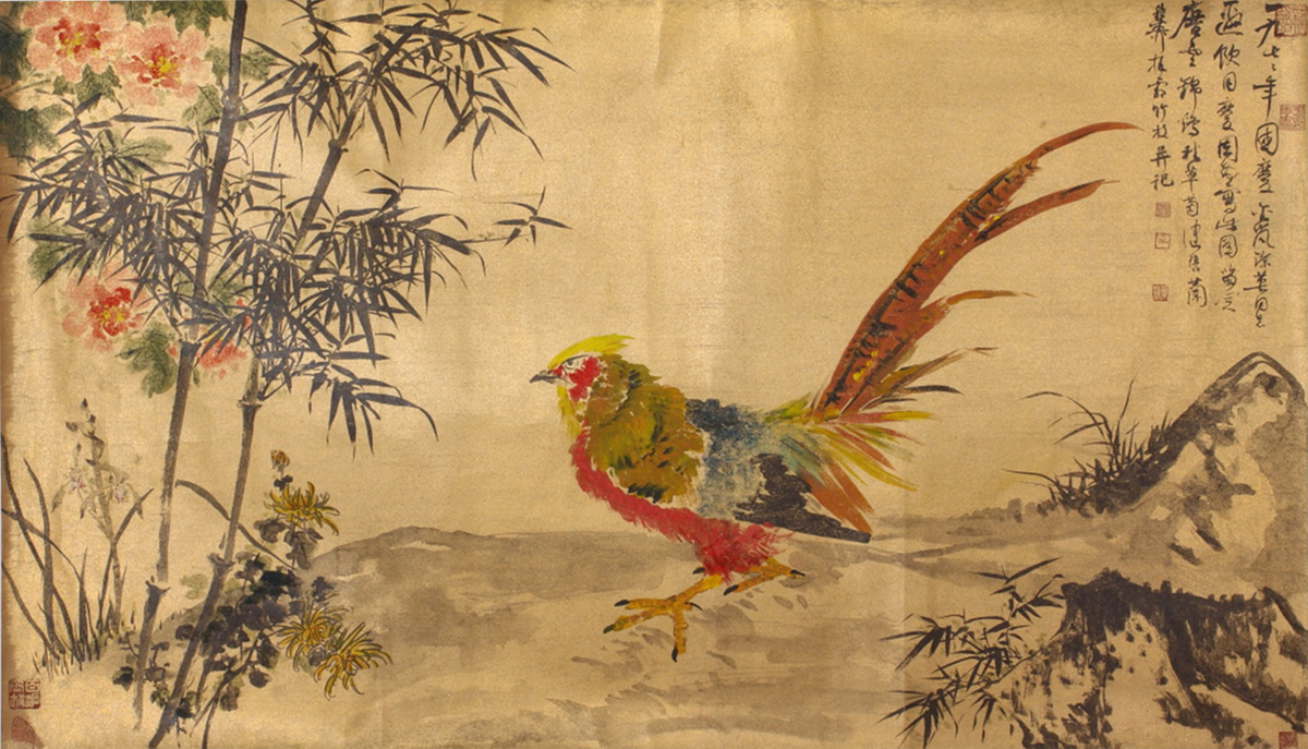 A Golden Pheasant and Flowers, drawn by Xie Zhiliu (1910-1997), Tang Yun (1910-1993), Chen Jianbi (1923-2020) and Chen Qiucao (1906-1988) [Photo/Official WeChat account of Fujian Museum]