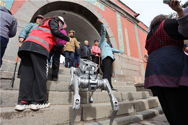 A robot dog is tested for transporting waste at the popular tourist destination, Taishan Mountain, in Tai'an, Shandong province. [Photo by Sui Xiang/For chinadaily.com.cn]