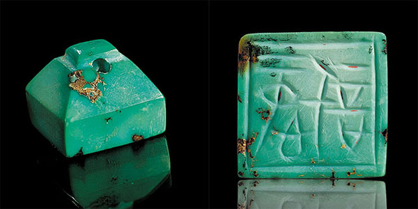 A turquoise seal and its stamp from the pre-Qin period (before 221 BC), with two characters zhong xin ("loyalty" and "trustworthiness"). [Photo provided to China Daily]